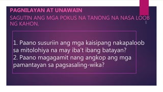 Ibigay ang mga aral mahahalagang kaisipang nakapaloob dito. Naiuugnay ang mahahalagang kaisipang nakapaloob sa mga karunungangbayan sa mga pangyayari sa kasalukuyan. Sinaunang Panitikang Pilipino Yamang pamana ng ating ninuno Pahalagahan at ingatan sa ating ma. Ang Aral para dito ay.