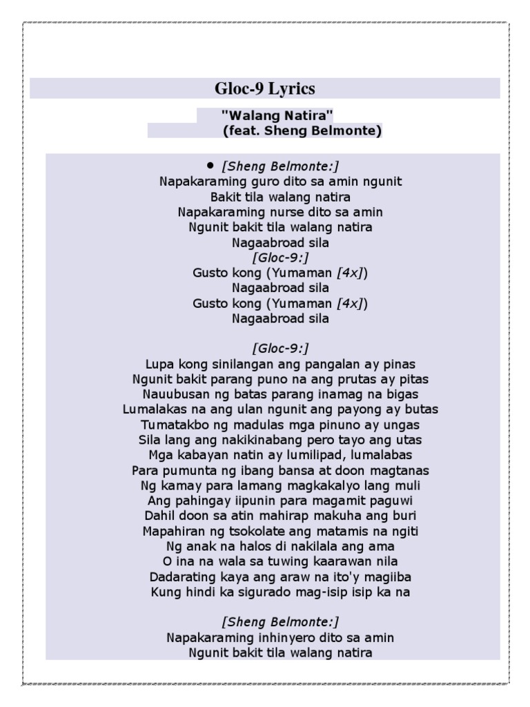 Matapos lamang sa kolehiyo matutubos din ang relo Bilhin mo na kung anong gustong laruan ni angelo Matagal pa kontrato ko titiisin ko muna to Basta ang mahalaga itoy para sa pamilya ko Chorus. Gloc 9 Walang Natira Lyrics napakaraming guro dito sa amin ngunit bakit tila walang natira aahhh napakaraming nurse dito sa amin ngunit bakit tila walang natira aahhh nagaabroad sila aahh gusto kong yumaman5x nagaabroad sila aahh gusto kong yumaman5x nagaabroad sila ahhh yung bayang sinilangan ang pangalan ay pinas ngunit bakit parang puno na. Ngunit bakit tila walang natira aahhh.